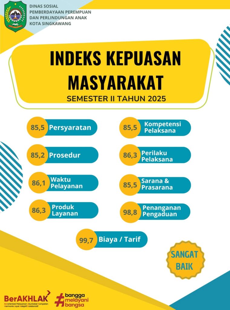 Indeks Kepuasan Masyarakat Semester II Tahun 2025 Dinas Sosial Pemberdayaan Perempuan dan Perlindungan Anak Kota Singkawang dengan nilai 88,7 atau Sangat Baik