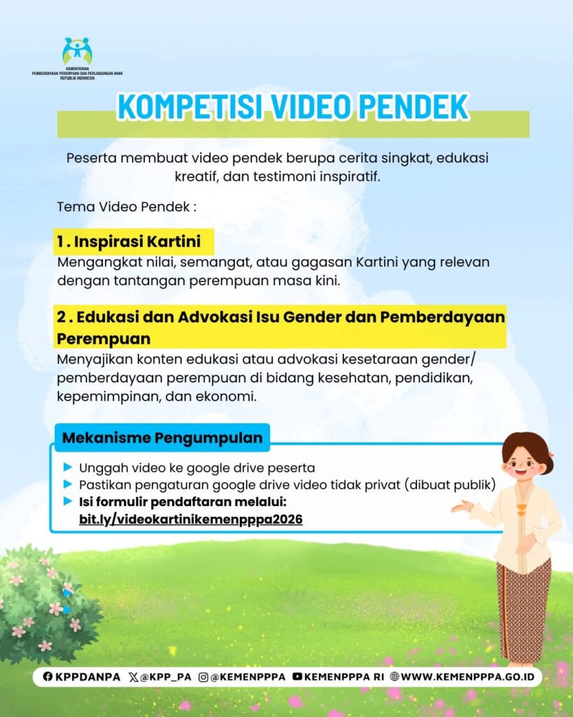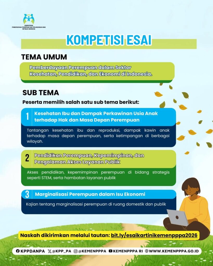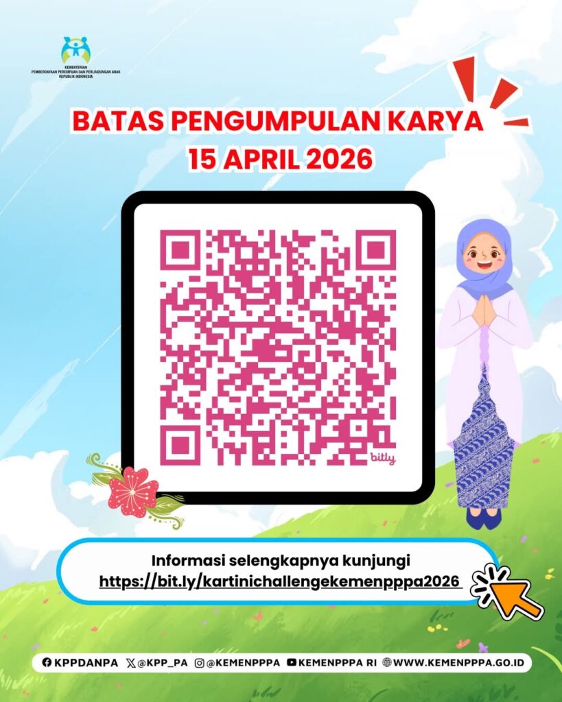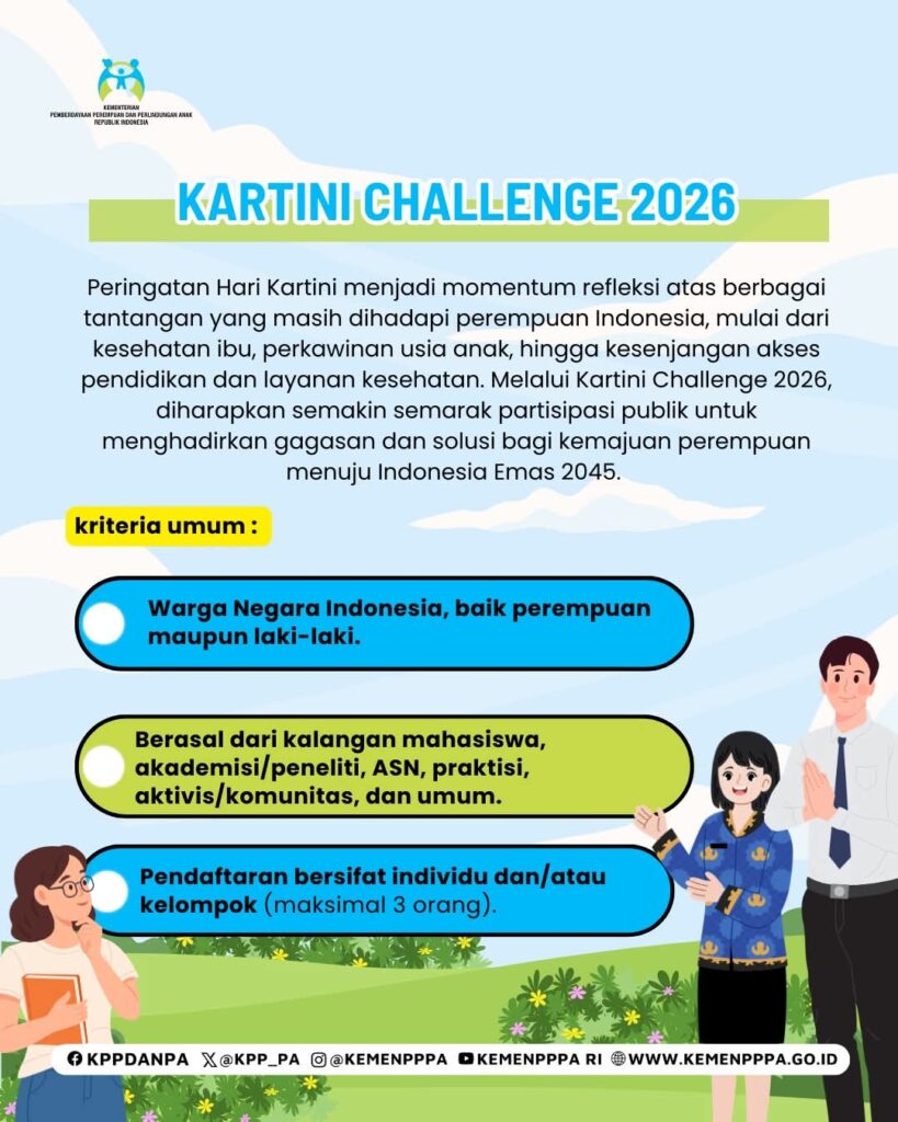 Yuk ikuti Kartini Challenge 2026 yang diselenggarakan oleh Kementerian Pemberdayaan Perempuan dan Perlindungan Anak dengan kompetisi esai ataupun kompetisi vidio pendek dengan tema sebagaimana tercantum dalam gambar berikut. Semua Warga Negara Indonesia dapat mengikuti kompetisi ini.
