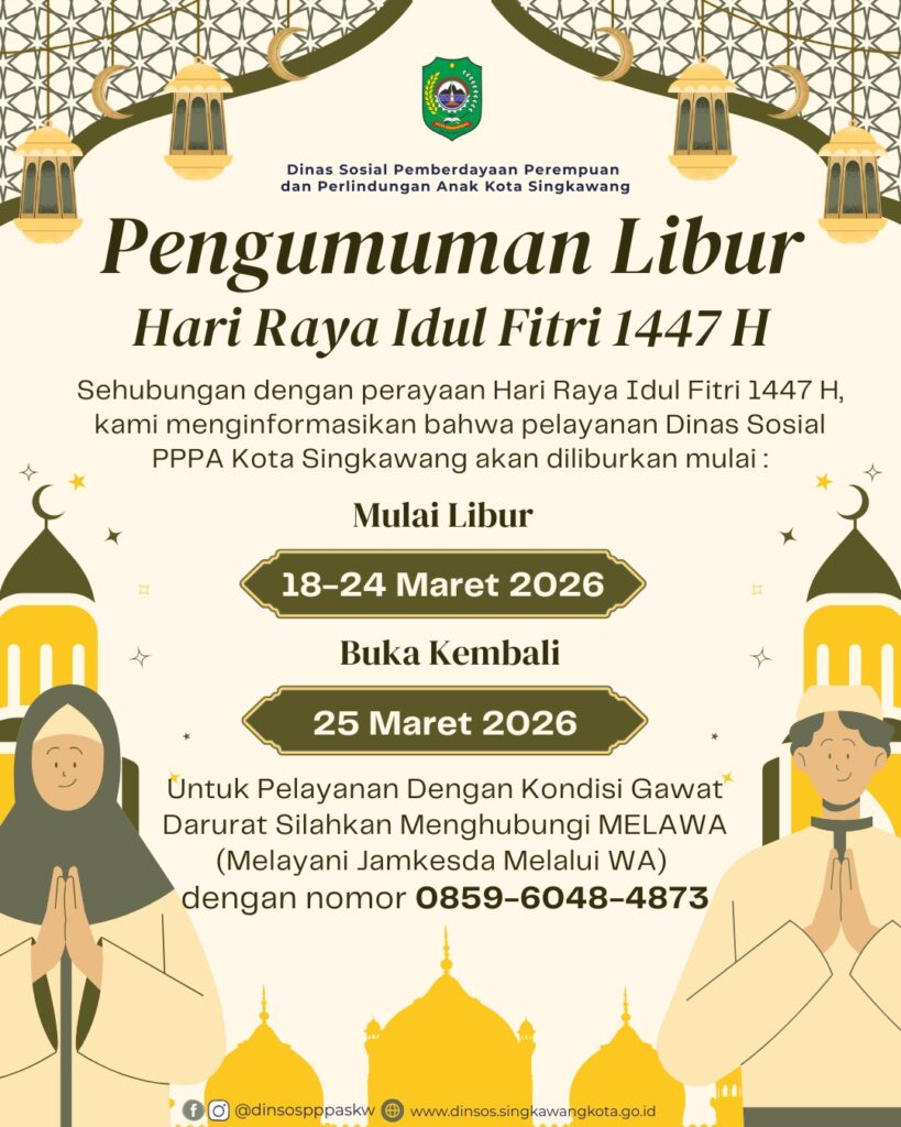Sehubungan dengan perayaan Hari Raya Idul Fitri 1447 H, kami menginformasikan bahwa pelayanan Dinas Sosial PPPA Kota Singkawang akan diliburkan mulai :